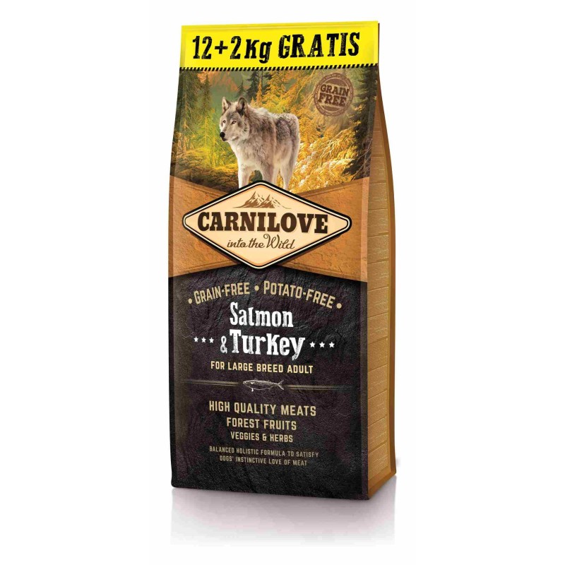 farine de saumon (25 %), farine de dinde (20 %), pois jaunes (20 %), graisse de poulet (conservée avec des tocophérols) (10 %), farine de canard (5 %), saumon sans arêtes (5 %), foie de poulet (3 %), amidon de manioc (3 %), pommes (3 %), huile de saumon (2 %), carottes (1 %), graines de lin (1 %), pois chiches (1 %), coquilles de crustacés hydrolysées (source de glucosamine) (0,05 %), extrait de cartilage (source de chondroïtine) (0,03 %), levure de bière (source de mannanes-oligosaccharides) (0,015 %), racines de chicorée (source de fructo-oligosaccharides) (0,01 %), yucca schidigera (0,01 %), algues (0,01 %), psyllium (0,01 %), thym (0,01 %), romarin (0,01 %), origan (0,01 %), cranberries (0,0008 %), myrtilles (0,0008 %), framboises (0,0008 %).